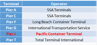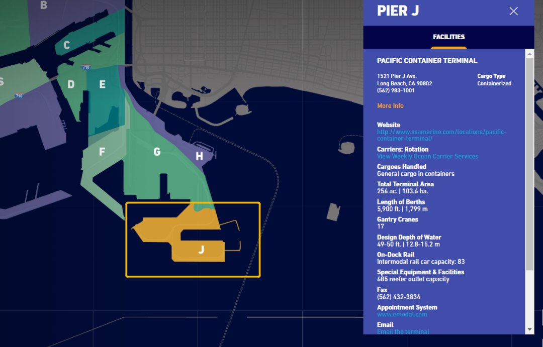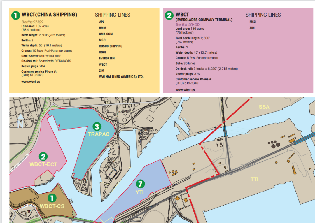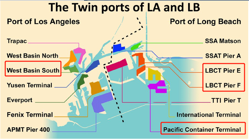 下兩圖是COSCO美西南航線碼頭分布。主要有三大碼頭: